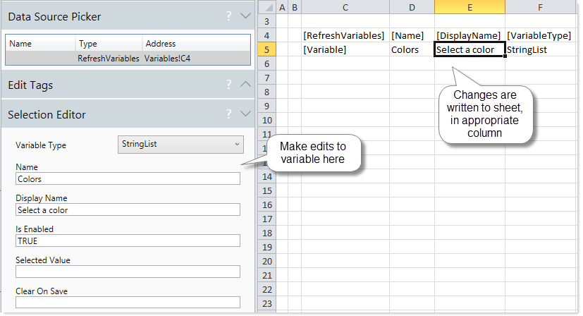 To edit an existing variable, place your cursor within the row, in the data source—either on the [Variables] tag or in one of the property columns. The properties for the variable display in the Selection Editor section of the Data Source Assistant, filtered by variable type. You can modify any of these properties and the changes are written back to the sheet, in the appropriate columns.