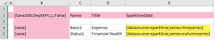 To save series data to a KPI table, you must place the special syntax in the SparklineData column for the save-to-database, as shown in the following screenshot: