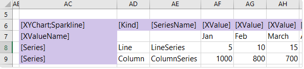 For example, you can create an XYChart data source named Sparkline, with two series. One is a line series named LineSeries and the other is a column series named ColumnSeries.