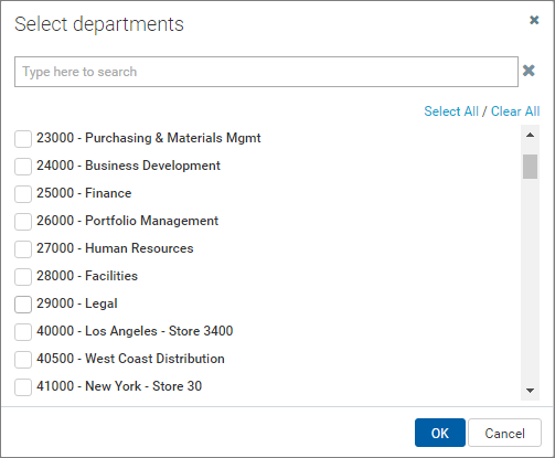 Users can use the search box in the dialog to find any value in the list. Users can select an item, then clear the search or define a different search, and select other items. All selected items will be remembered and applied when the user clicks OK.