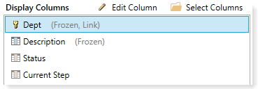 If you edit the attributes for a column, some of these changes display in parentheses after the column name in the Display Columns box. This is so that you can see certain attributes at a glance without having to open the Edit Columns dialog for each column. For example, in the following screenshot you can easily see which columns are frozen and which column contains the link to the Process Routing page.