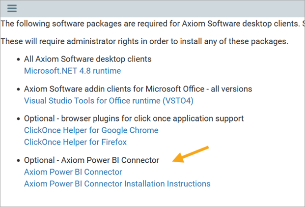 The Axiom Power BI Connector is a file named Axiom.pqx. You must download this file and save it to a designated location on your desktop in order to use the connector in Microsoft Power BI Desktop.