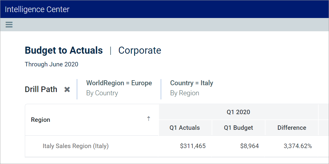 The current drill path displays along the top of the page. The drill path identifies the row that was drilled and the current drill level. If you have drilled the drill results, the previous drill levels also display in the drill path. You can click a previous drill level to return to that level, or you can click the X icon to clear the drill and return to the original report grid.