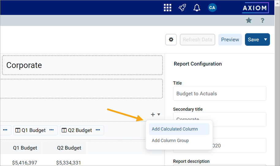 In the Report Canvas of the Report Builder, click the plus sign in the top right corner of the Column Definitions box, and then click Add Calculated Column.