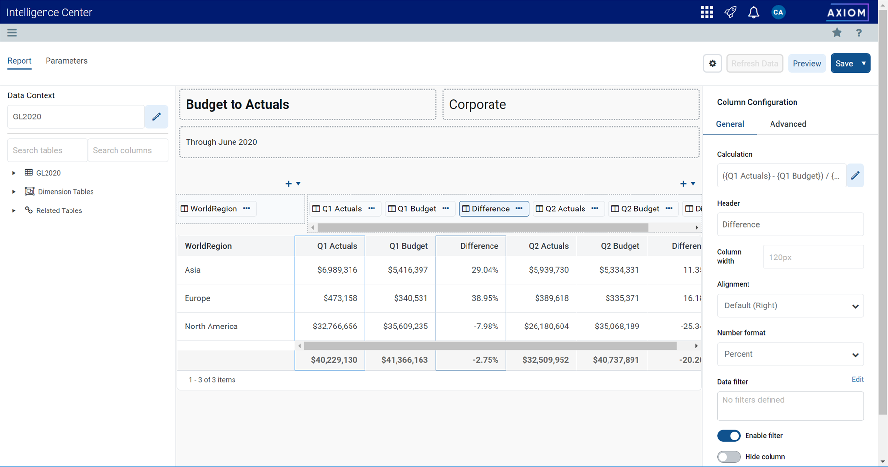 Use the Column Settings in the Configuration Panel to configure display properties for the column, such as column width, alignment, header text, and formatting. For more information, see Configuring column properties for a web report.