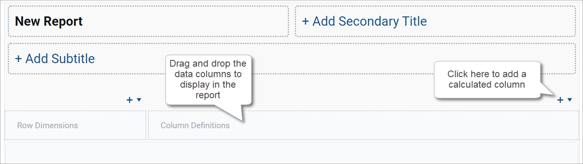 The data columns and calculated columns for the grid are placed in the right-hand box at the top of the Report Canvas, known as the Column Definitions box. This box defines the columns to display in the report. Although it is possible to add columns and calculated columns to the Column Definitions box before specifying a row dimension or a fixed row structure, the grid in the Report Canvas will not populate until the rows are defined.