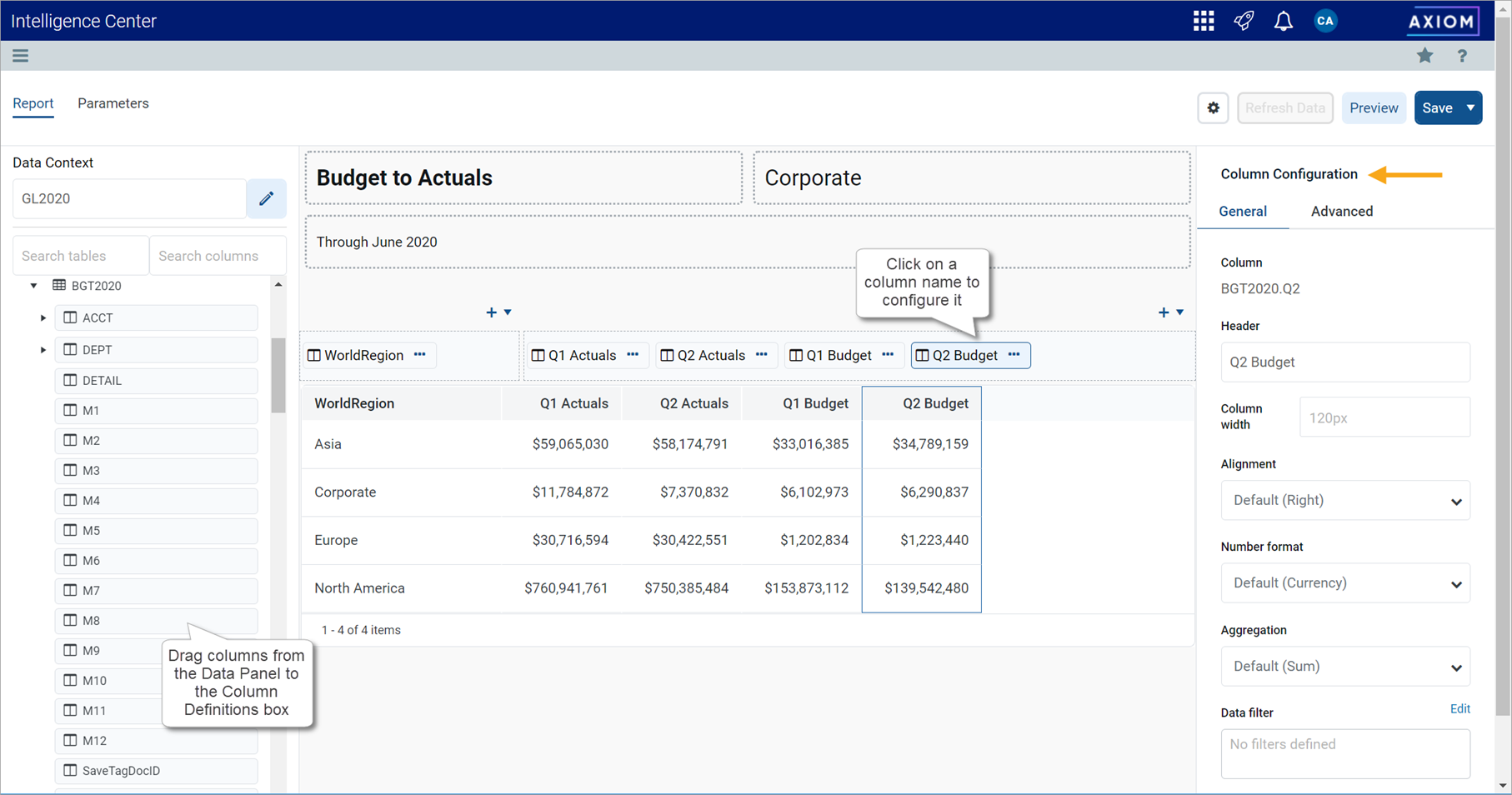 To display data in the report, you can drag and drop table columns from the Data Panel to the Column Definitions box in the Report Canvas. The Data Panel displays the tables and columns that are eligible to be included in the report, based on the selected data context (primary table) and the specified row dimension.