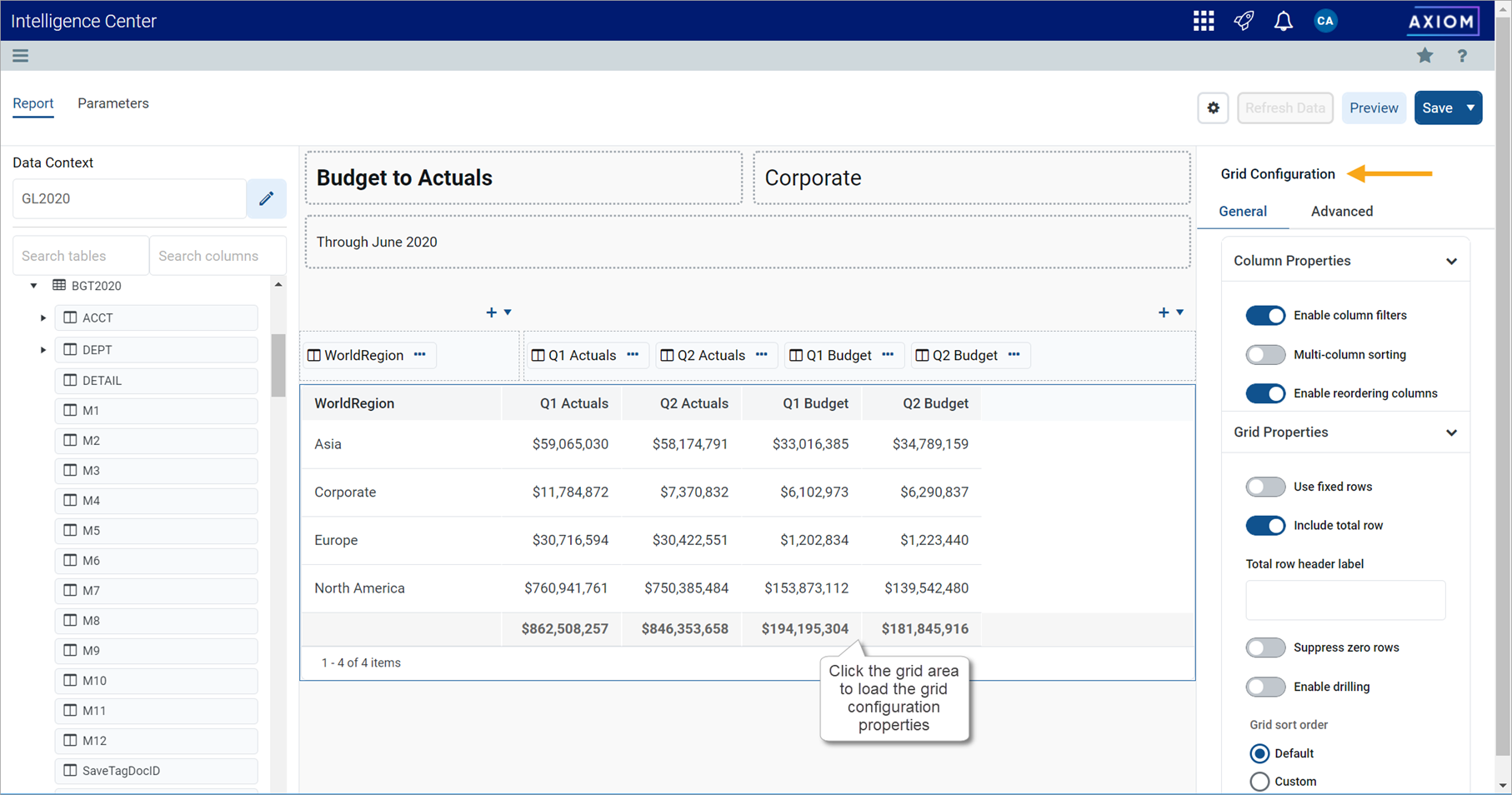 In the Report Builder, the grid properties are defined in the right-hand Configuration Panel.