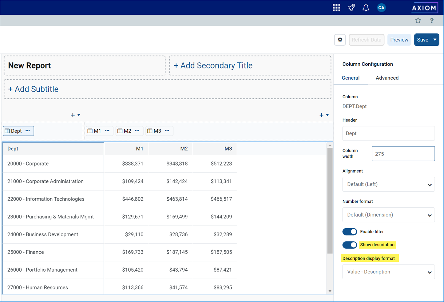 In the following example, the Dept column has been configured to show descriptions using the Value - Description format. If you select a format that shows descriptions first, such as Description (Value), then the rows will be sorted by the descriptions instead of the underlying values.