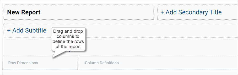 The row dimension for the report is placed in the left-hand box at the top of the Report Canvas, known as the Row Dimensions box. The report grid cannot render until you specify either a row dimension or a fixed row structure.