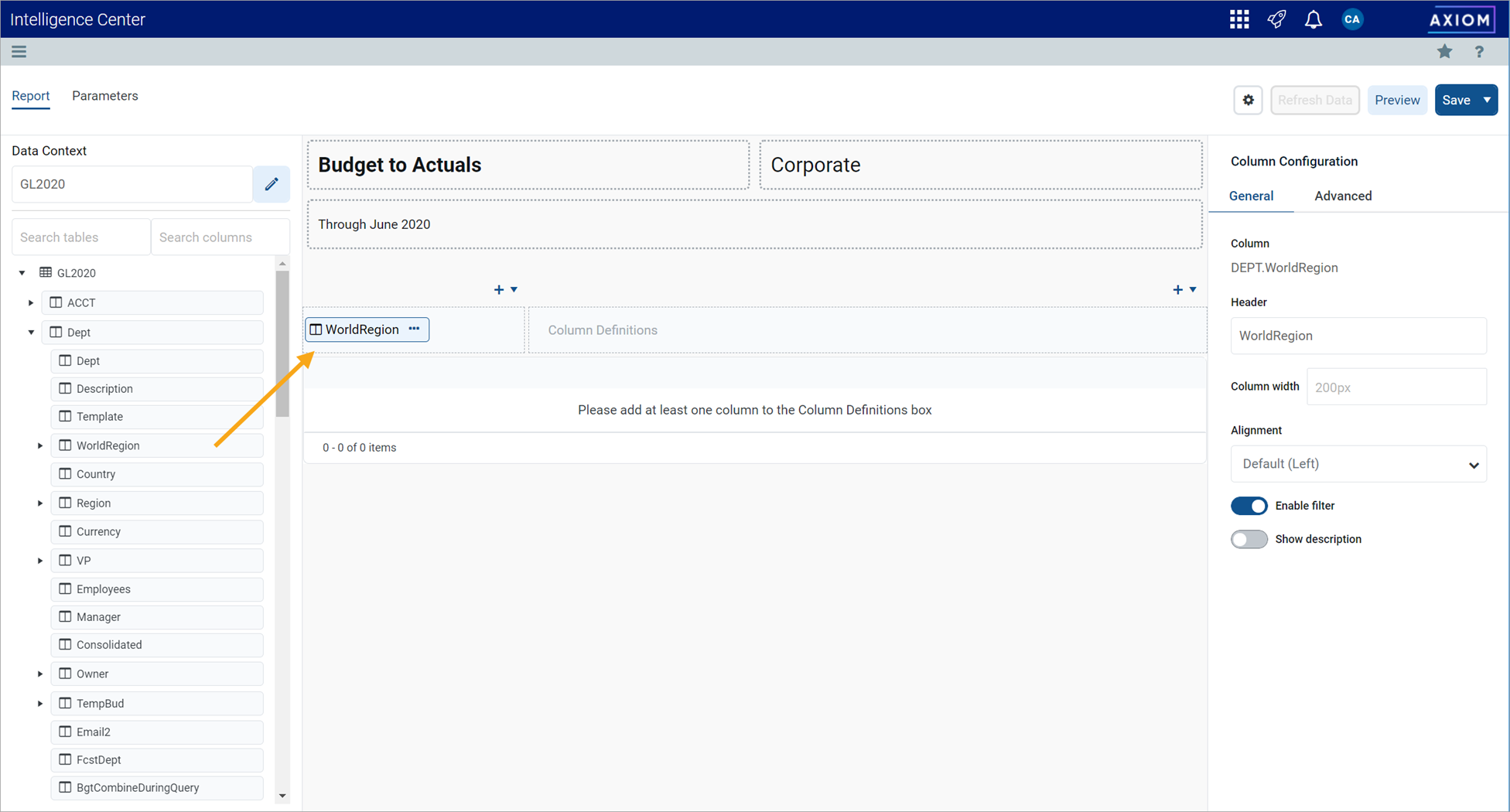 NOTE: If you drag and drop a validated column from a data table to use as the row dimension, such as GL2020.Dept, this column reference is automatically "elevated" to point to the lookup table instead, meaning Dept.Dept. This is done so that the column reference is compatible with other data tables that reference the same lookup table. This elevation only occurs if the validated column looks up to a shared dimension table.