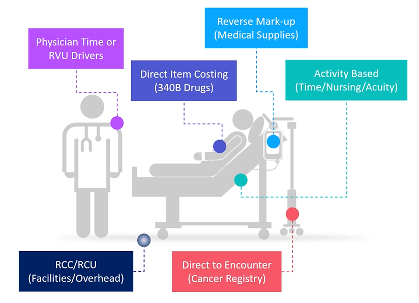 Traditional costing approaches include Ratio of Cost to Charge (RCC), Relative Value Unit (RVU), and Relative Cost Unit (RCU). These methods are well-known and frequently used in the healthcare industry. These more basic methods can be used for indirect costs, areas where scrutiny of results is less of a focal point, or where resources are limited in some way.