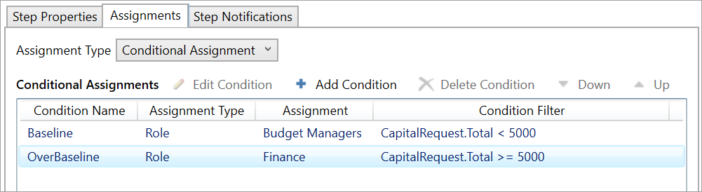 The defined conditional assignments are shown in a grid within the Assignments tab. In the following example, there are two conditional assignments. All plan files with less than 5000 in the Total column will be assigned to the Budget Managers role, and all plan files equal to or greater than 5000 will be assigned to the Finance role. You can define as many conditions as needed, and each condition can use a different assignment type.