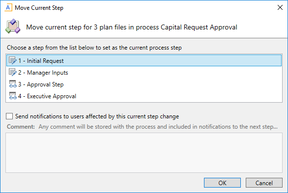 • If you want to send notifications to the new step owners for the target step, select Send notifications to users affected by this current step change. If this check box is selected, then you can also optionally enter a comment to be included in the notification and stored with the process. By default, notifications are not sent to new step owners when moving plan files to a different step.