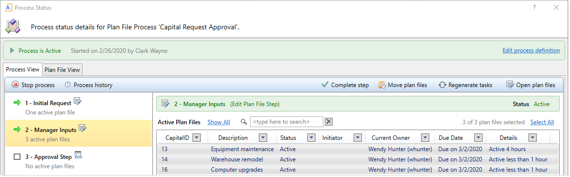 Using the Process Status dialog to move plan files to different steps (Desktop Client)