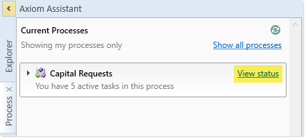 In the Process task pane (or a custom task pane configured to show the process control), click the View status link for the process.