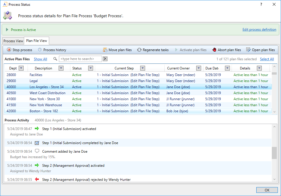 The Plan File View tab contains a grid of all plan files in the process, showing the current status and currently active step (if applicable). You can search for a particular plan file using the filter box at the top of the grid. Additionally, you can use standard Axiom grid functionality to sort, filter, and group the list. You can select a plan file in the grid to view the full process activity for that plan file, shown at the bottom of the dialog.