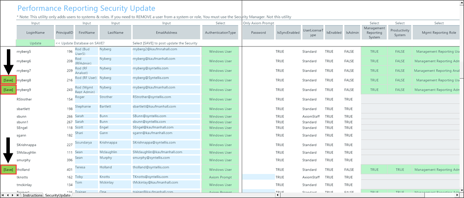 - Changes to a username, email, or password may not trigger a save unless accompanied by other changes, such as a change to filters, subsystems, or roles, that trigger the [Save] tag. If a [Save] tag does not appear at the beginning of a row to which you made a change, the change is not saved. Make the changes in the Security Manager if you are unable to make them in the update utility.