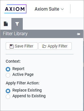 NOTE: Axiom Strategic Financial Planning does not perform any validation to determine whether the selected filter is relevant to the current report or page. Depending on the report configuration and the data shown, the selected filter may have no impact on the report or the page.