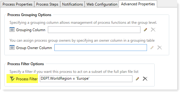 In the example screenshot above, the filter is Dept.WorldRegion='Europe'. This means that only plan files that are assigned to the Europe world region can be started in this process. Plan files that belong to any other world region cannot be started in this process.