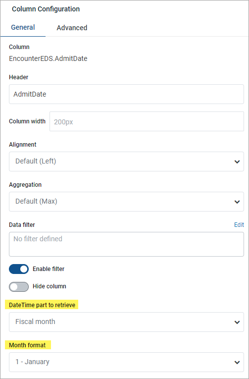 Date parts can also be used when defining filters for the report data, such as general filters or column filters. This makes it easier to construct filters based on a portion of the date or date-time value. For more information, see Using date part filtering.