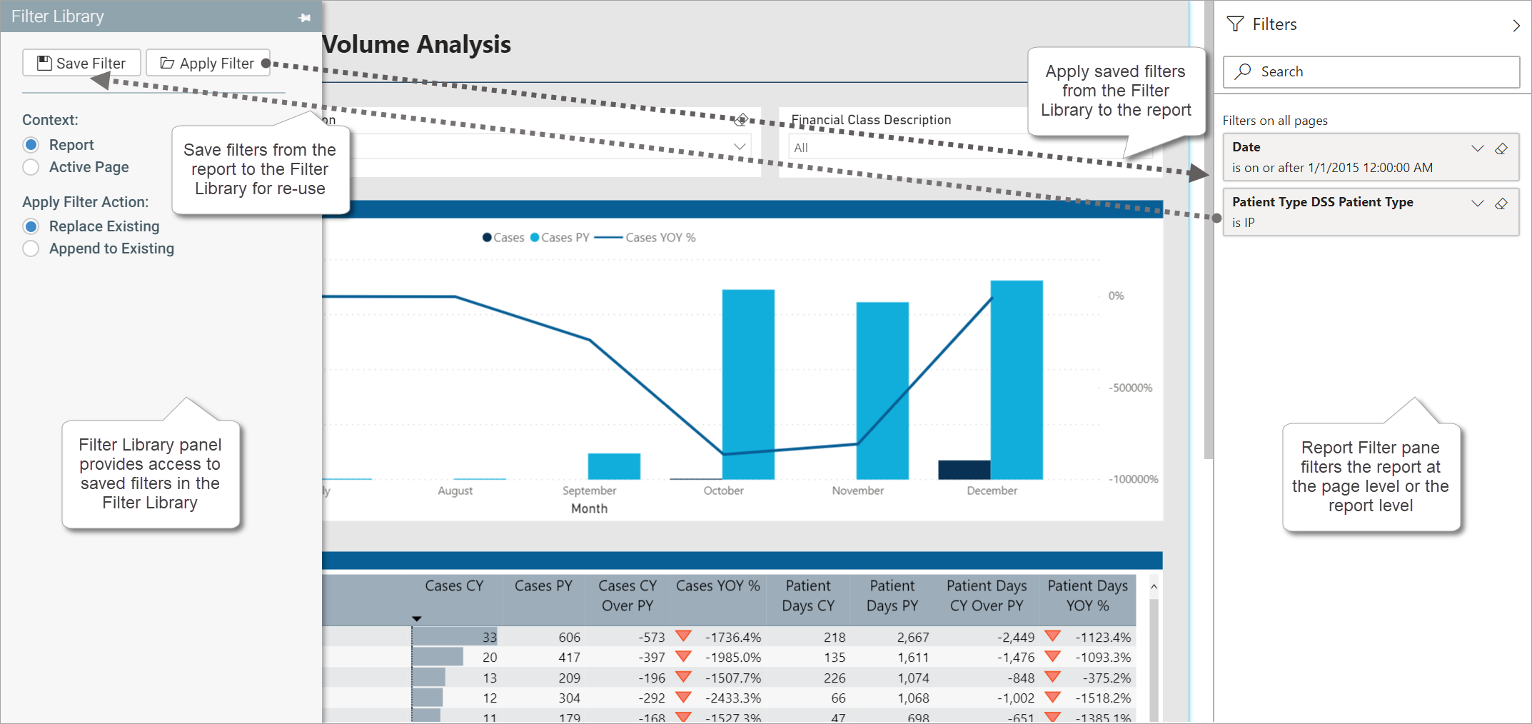 While you are in a visualization report, you can apply a saved filter in the Filter Library to that report. When applying a saved filter, you can choose to apply it at the page level or the report level, and you can choose whether to overwrite existing filters or append to existing filters. The data in the page or report is then refreshed according to the applied filter.