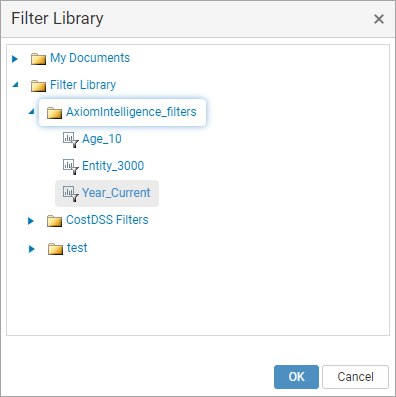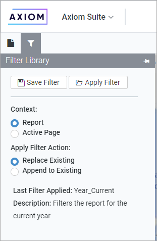 NOTE: Axiom Strategic Financial Planning does not perform any validation to determine whether the selected filter is relevant to the current report or page. Depending on the report configuration and the data shown, the selected filter may have no impact on the report or the page.