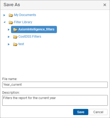 In the Save As dialog, select the folder where you want to save the filter, then enter the File name and optional Description. Click Save to save the filter to the specified location.