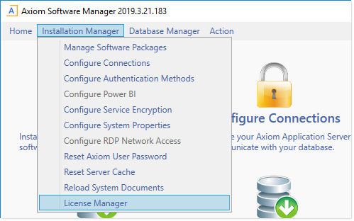 If needed, you can use the Axiom Software Manager on the Axiom Application Server to update the license file. This activity requires administrative permissions on the server, and is typically performed by your Information Technology department. You will need to provide your IT department with the license file provided to you by Kaufman Hall Software Support.