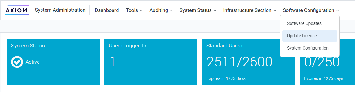 Administrators can update the Axiom Strategic Financial Planning license file from within the application. Alternatively, your Information Technology department can apply the new license file using the Software Manager.