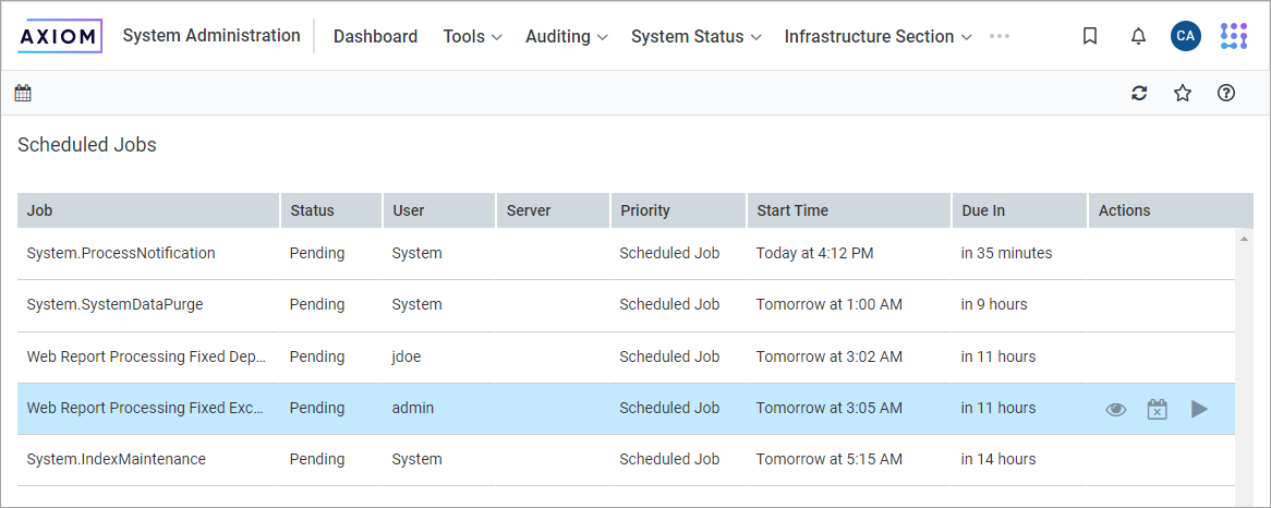 The Scheduled Jobs grid displays all jobs that are scheduled to be processed, or are currently in process. This includes scheduled jobs, jobs executed manually via Run Now, and jobs that were triggered for execution via an event handler.