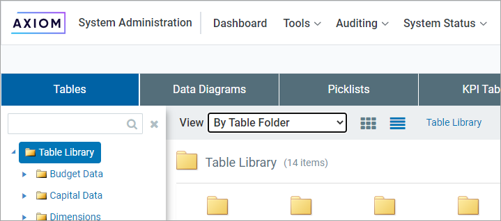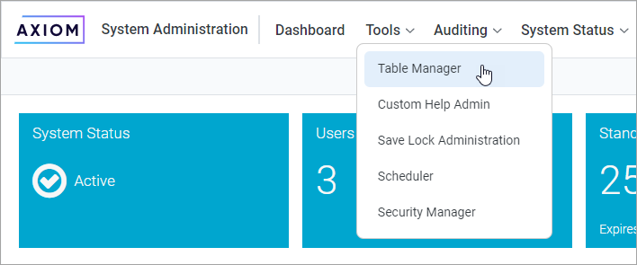 NOTE: The System Administration menu item is only available to administrators and to users with special permissions to various features in the system administration area. However, any user can access the Table Manager area if they use the direct URL. Once a user accesses the Table Manager, what they can see and do is controlled by their security permissions.