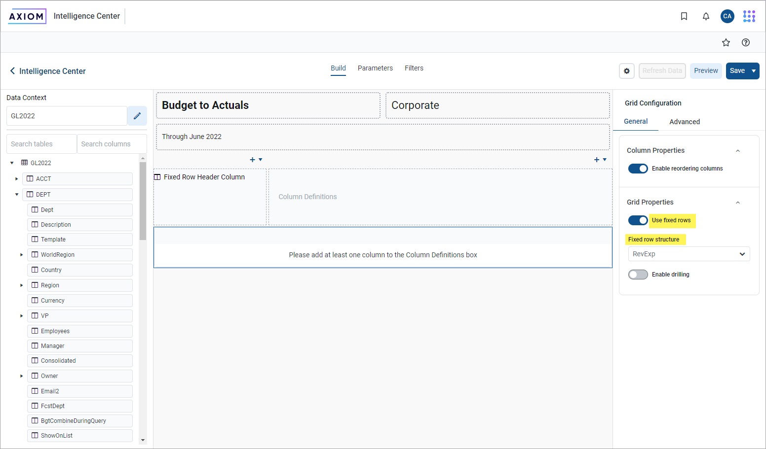 Fixed rows: Select the grid placeholder text in the Report Canvas so that the Grid Configuration properties load into the Configuration Panel. On the General tab, enable Use fixed rows then select an existing Fixed row structure. For more information, see Specifying the fixed row structure for a web report.
