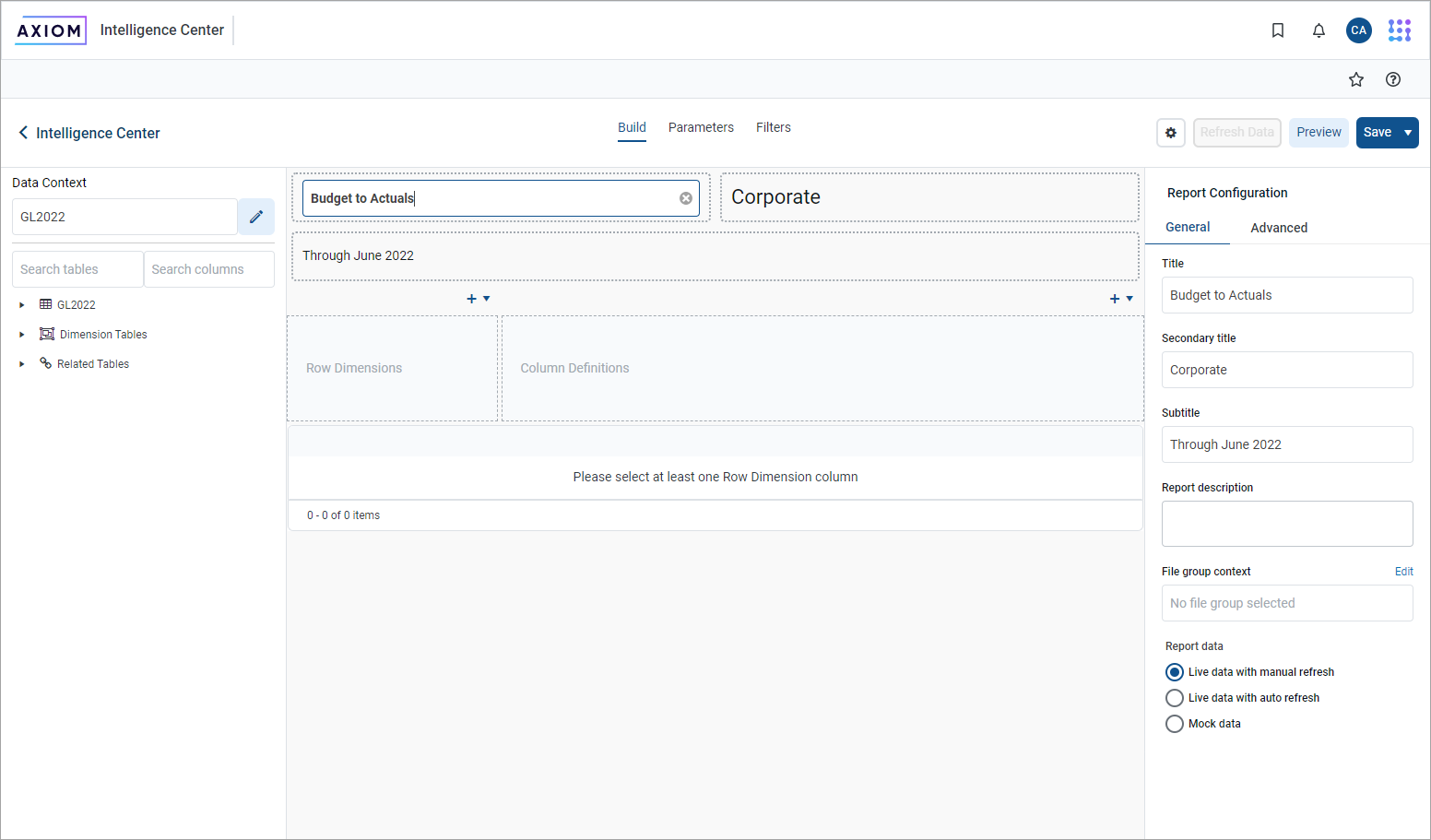 NOTE: To populate the grid with data after adding columns to the Column Definitions box, click the Refresh Data button. By default, the Report Builder uses live data, but you must manually refresh in order to see the result of any data changes. For more information, see Changing data display options for the Report Builder.