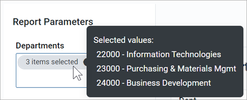 You can select one or multiple values for each parameter, depending on the parameter type and configuration. If a parameter allows multiple values to be selected, the parameter box shows text such as "3 items selected". You can hover your cursor over this text to view the selected values in a tooltip.