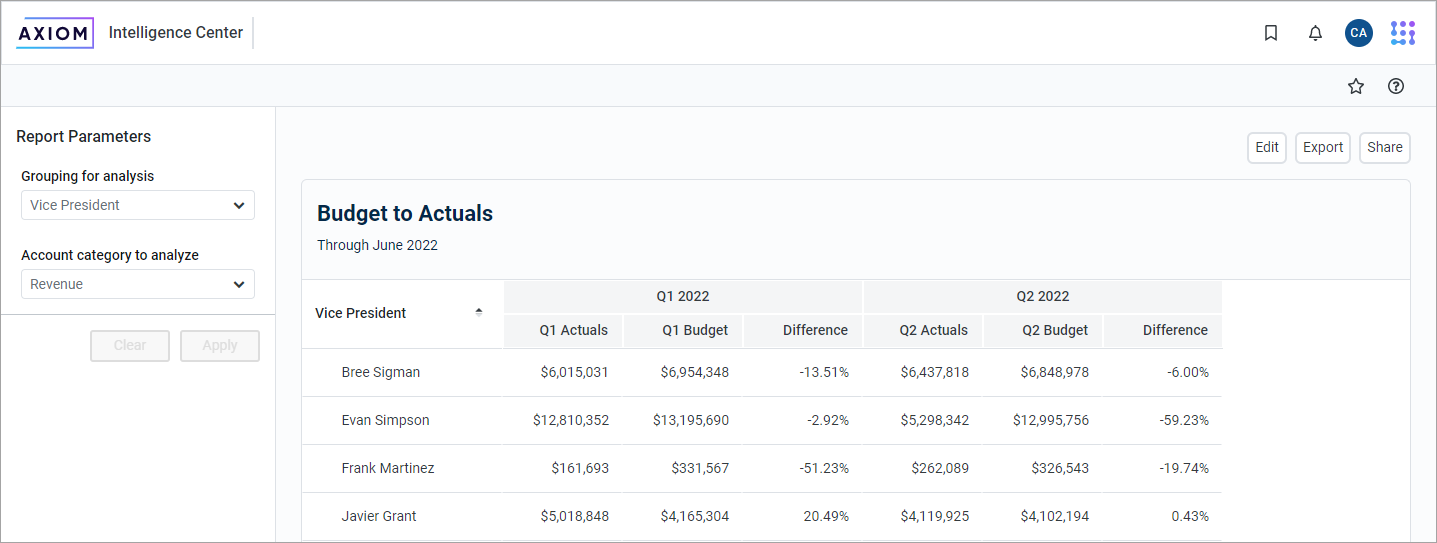 Click Apply to refresh the report using your parameter selections. The Apply button is not active until all required parameters have selected values.