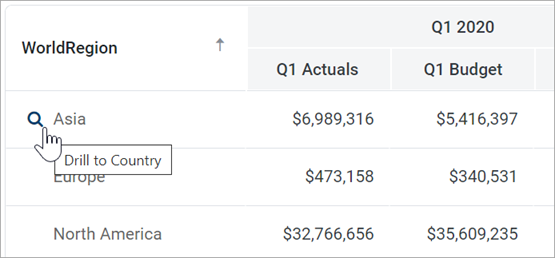 The tooltip for the magnifying glass will be either "Drill" (if multiple drill paths are available) or "Drill to <path>" (if a single drill path is available). For example, the tooltip will say "Drill to Acct" if the Acct drill path is the only available drill path.