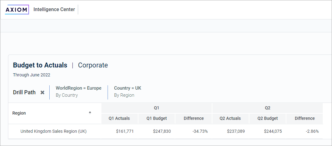 You can continue drilling the drill results if additional drill paths are available. You can return to a previous path by clicking on that path name in the header. When you are finished viewing the drill results, you can click the X icon in the drill path to clear the drill and return to the original report.