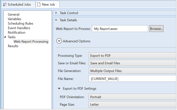 10. Complete the remaining task and job settings as desired. For more information, see the Scheduler documentation. Note the following: