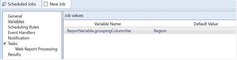 In this example, the ID of this refresh variable is groupingColumnVar. Therefore to pass a value to this refresh variable, a Scheduler job variable named ReportVariable.groupingColumnVar can be used. This variable must be assigned a value that exactly corresponds to a value that can be selected for the refresh variable within the Refresh Variables panel.
