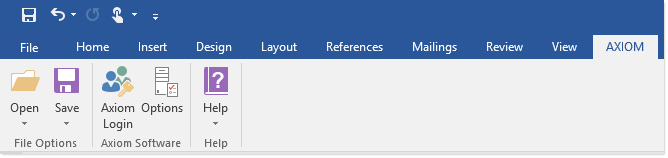 The add-in displays as an Axiom tab within Word or PowerPoint. The tab displays on the right-hand side of the ribbon, after the standard Word or PowerPoint tabs but before any special context-sensitive tabs.