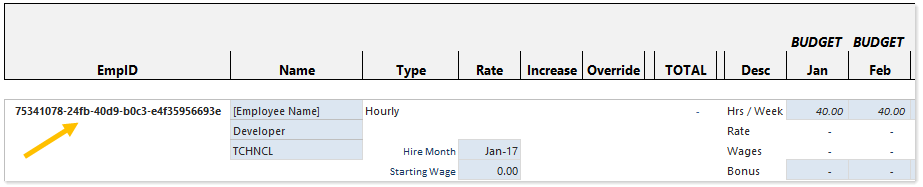 GUID variables can be used to generate a globally unique identifier (GUID) when a calc method is inserted. This is a special variable type that does not display to the user in the Calc Method Variables dialog—it is only used to generate the ID and place it into the inserted calc method. For example, when inserting calc methods for planning new hires, you may want to generate a unique ID for each new hire.