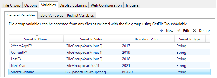 {ShortFGName}. This variable could reference the short version of the file group year and resolve to something like BGT20 (for a file group named Budget 2020). This variable could be used in several places, such as in the file group tab prefix, as well as in table variables for your drivers.