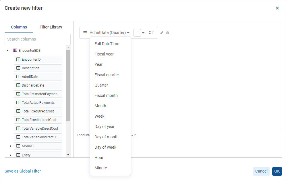 For Date and DateTime columns, you can specify a date part to base the filter on, instead of basing the filter on the full date or date-time. For example, you can specify Quarter as the date part and then create a filter to only show records where the date is in the second quarter. You can select any of the available date part options and use any of the valid values in the filter.