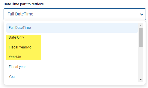DatePartName is the name of the date part to return, such as Year, Month, YearMo, or Quarter. All of the date parts that are available for use in web reports are also available for use in Axiom queries.