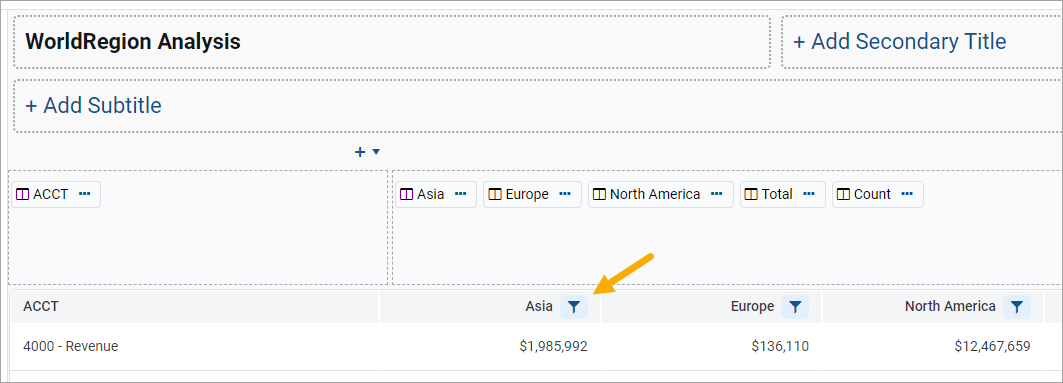 Columns and column groups with filters now display with a filter icon in the Report Builder. This makes it easy for the report designer to see at-a-glance that a particular column or group is being filtered.