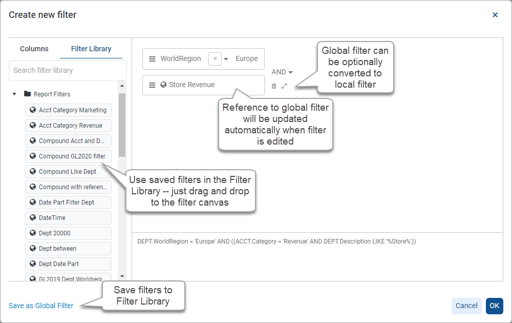 Ability to use predefined filter statements as global filters or as starting points for custom filters (see next section for more information)