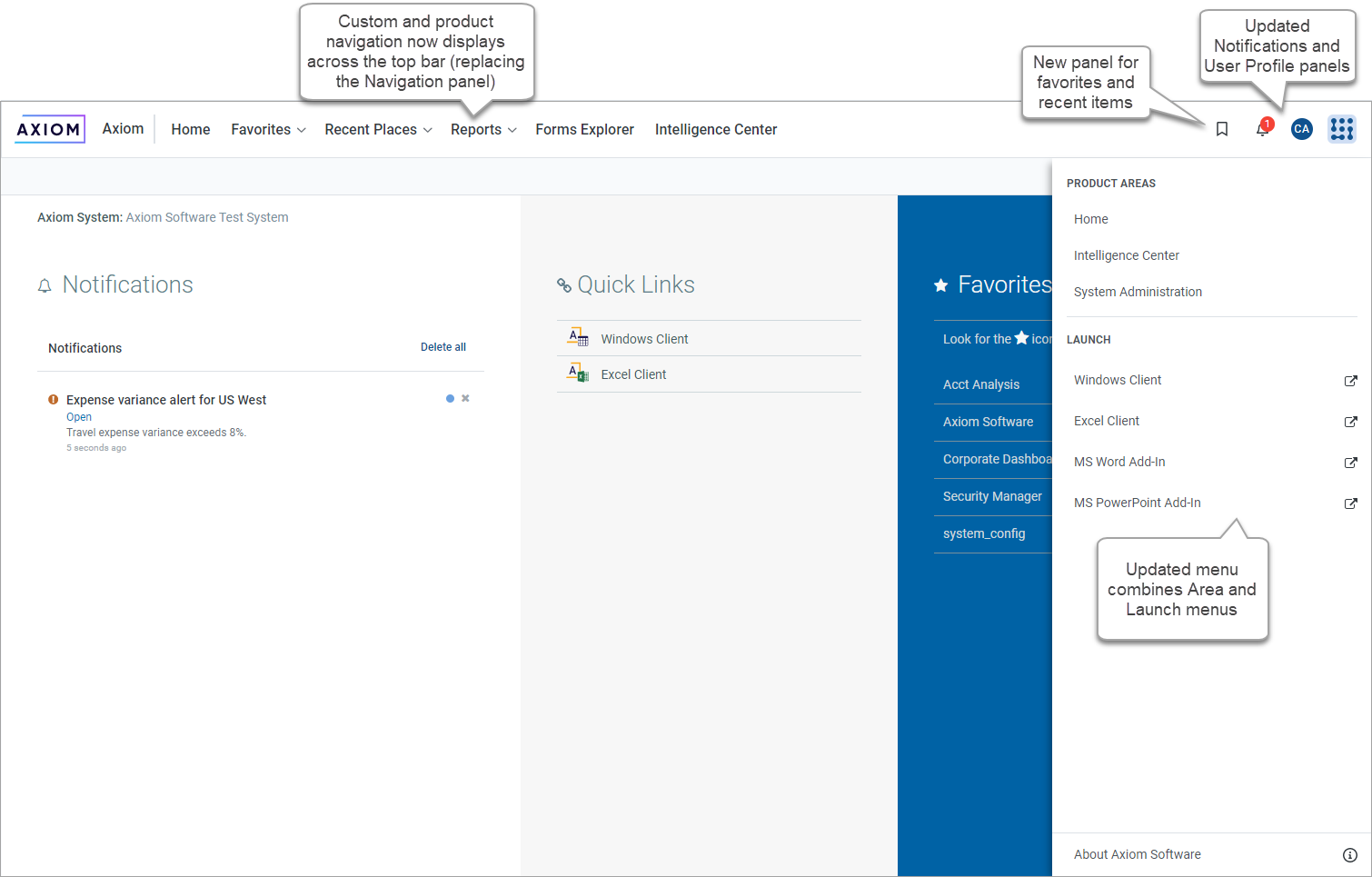 - Area menu and Launch menu combined into a single menu for quick access to different product areas and applications