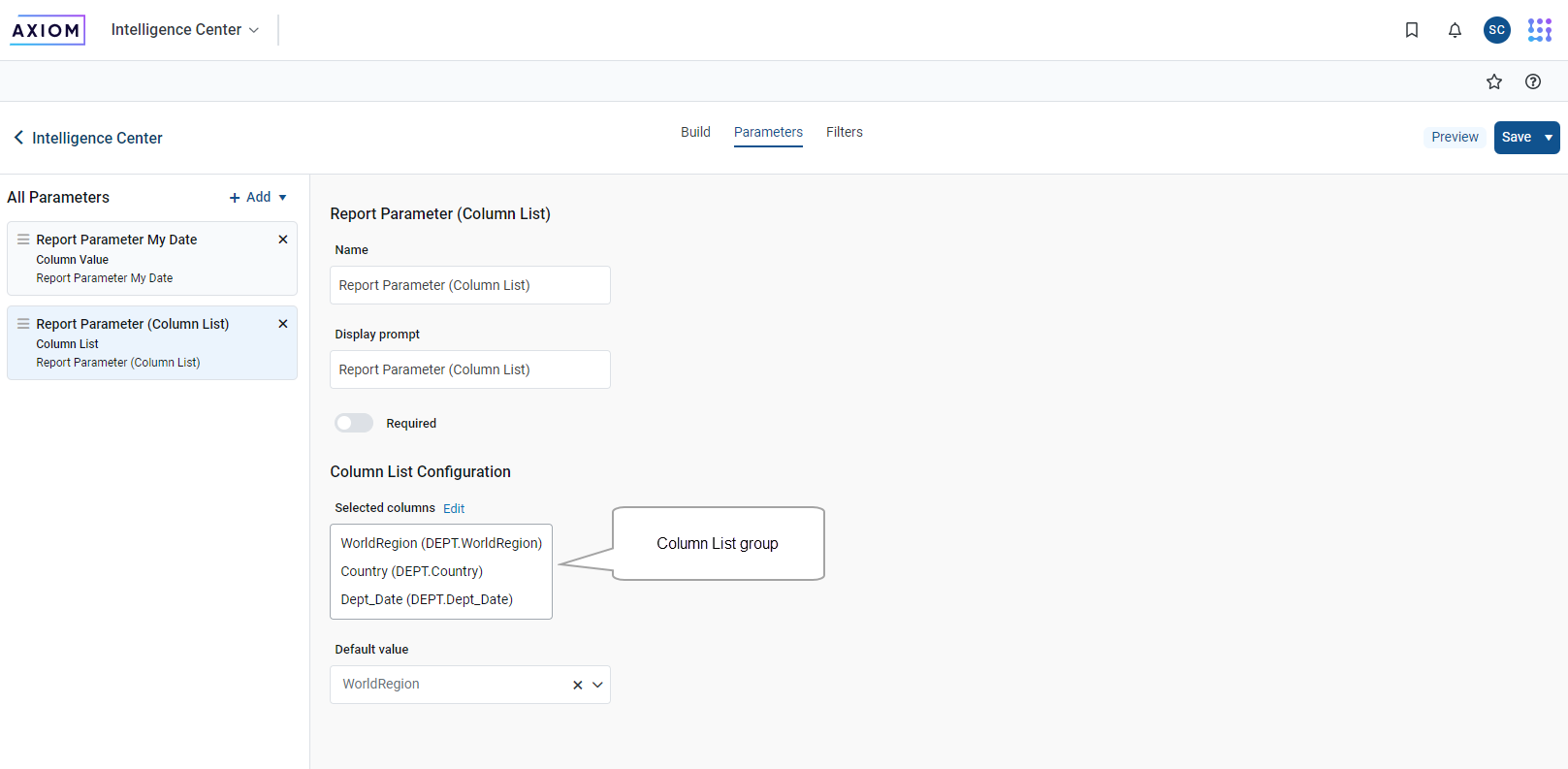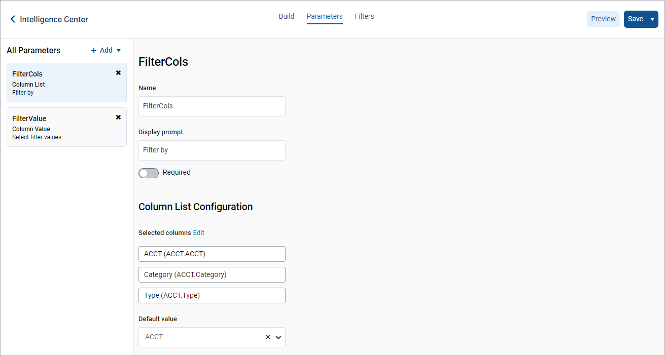 Click Parameters and select ColumnValue with the Static column option. The ColumnValue report parameter is listed in the All Parameters section. Click the Edit button next to the name of the select column to open a window where you can configure your parameter.