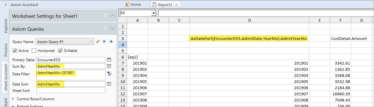 For example, the following report uses date part syntax to group, sort, and filter the report by the YearMo date part: